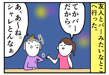 思いつかんかった。(ギリ歯ぎしり) 結局絞り出して放った一言が「同じで」でして、ある意味一番ダサいやつですからね、セリフもぎ取っといて絞り出しが同じて、もはやトレンディドラマやりたいだけの子なんかなってテンダーさんに思われても仕方ないやつですからね。ほいで