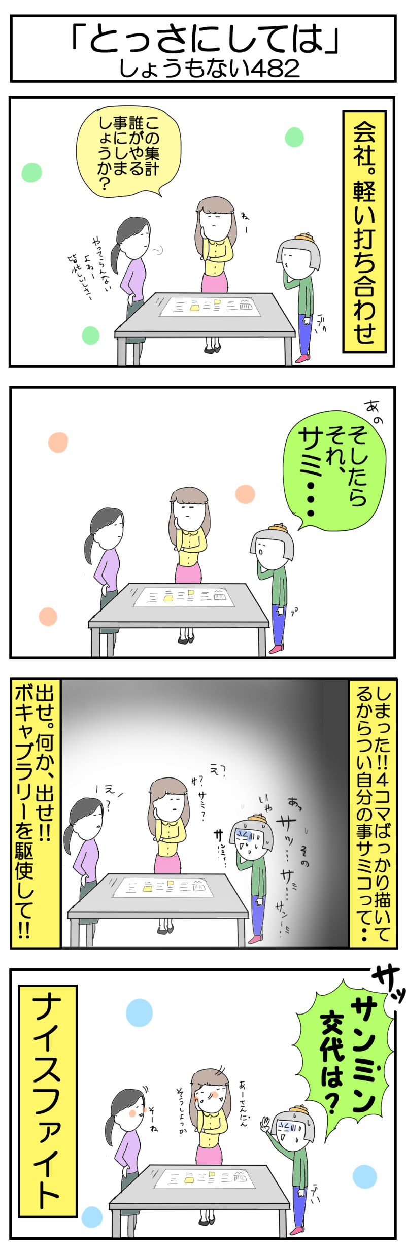 おはよーっす。おつかれーっす。サミコれーっす。4コマも500回近くなってきたら自分の事サミコって会社で言いそうに何度もなるよ。言っても全然支障無いだろうけど、念には念さ✡雑務買って出ようと思ったんだけど意図とせず交代制になったよ。ま、結果オーライだね✡